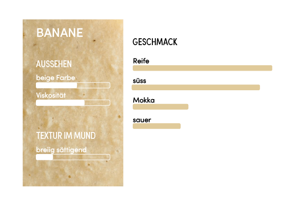 Der perfekte Reifegrad der ausgewählten Früchte verleiht einen natürlich süßen Geschmack und aromatische Noten von Mokka. Durch das Vorhandensein von Stärke kann die Textur dieses Pürees klebrig und mehlig erscheinen.