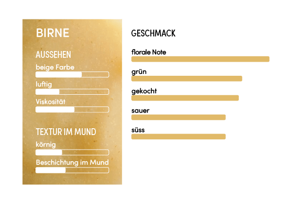 Das ‚Les vergers Boiron‘ Birnenpüree enthält aromatische Noten von anderen Obstgartenfrüchten (z. B. Apfel), trockene Noten mit Anklängen an grünen Tee und karamellisierte Noten. Die körnige Konsistenz im Mundgefühl spiegelt die charakteristische Beschaffenheit der Birne wider.
