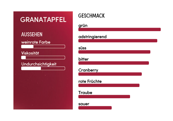 Die Mischung der Sorten Wonderful und Mollar sorgt für ein einzigartiges aromatisches Gleichgewicht. Die Kraft der Wonderful wird durch die milde Mollar mit gemüsigen und fruchtigen Noten nach roten Früchten, Weintrauben und Cranberry abgeschwächt.