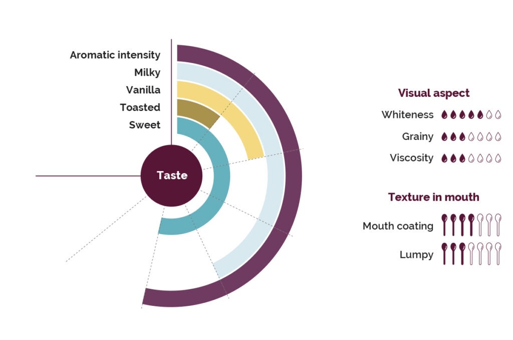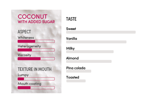 The product has a creamy texture due to its high fat content. These lipids are also responsible for the coconut milk aromatic notes found in this puree.