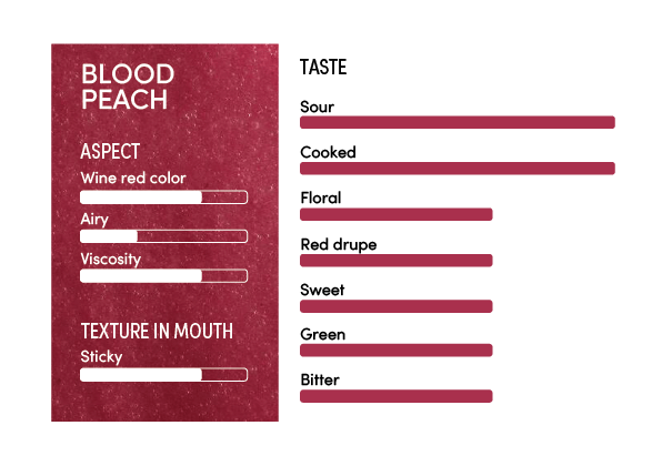 With an intense wine-like color, resulting from the transformation of the flesh with the skin, the blood peach puree has a thick consistency. In the mouth, it offers a coating sensation, characteristic of this fruit.
