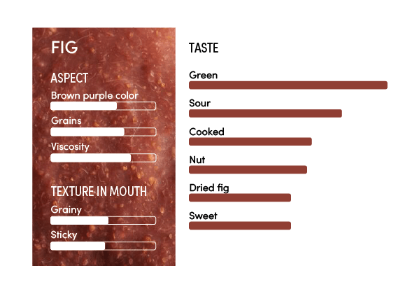 The tasting reveals the aromatic characteristics of fresh fruit: the tangy and vegetal notes are balanced with the naturally sweet taste of figs picked at full maturity. More subtly, there are hints of dried fruits such as chestnut. Featuring a deep purple-brown color, the Les vergers Boiron fig puree offers a rather thick consistency, with visible seeds that are perceptible in the mouth, providing a sensation close to that of a freshly crushed fig.
