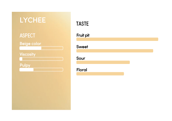 The lychee puree has a rich aromatic profile, expressed through rose notes, particularly from the Black Leaf variety. It also features muscat notes in a delicately sweet overall flavor.