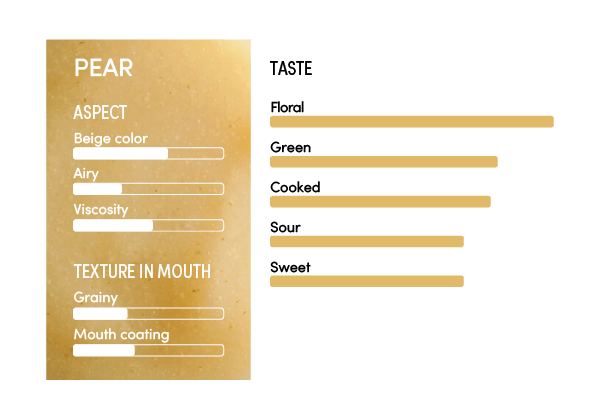 This puree contains aromatic notes of other orchard fruits (such as apple), dry notes reminiscent of green tea, and caramelized hints. Its grainy texture in the mouth reveals the characteristic seeds of the pear.
