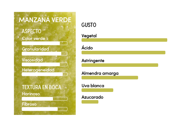 El puré de manzana ‘Les vergers Boiron’ ofrece el potente carácter acidulado de la Granny. Encontramos notas verdes sutiles como notas herbáceas, de almendra amarga y de uva.