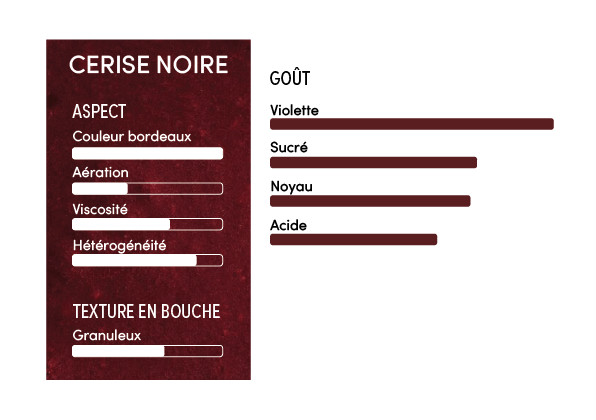D’une grande richesse aromatique, la purée de cerise noire de Bâle est caractérisée par la saveur naturellement sucrée du fruit, enrichie de notes acides auxquelles viennent s’ajouter de puissantes notes florales de violette et des notes d’amande amère provenant de la présence du noyau lors de la transformation.