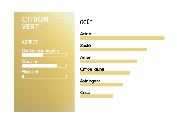 La purée de citron vert des vergers Boiron se caractérise par un jus de couleur jaune pâle et opaque, en raison de la présence de pulpe non clarifiée.