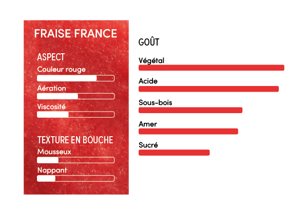 La purée de Fraise Cléry proposée par Les vergers Boiron affiche une couleur rouge carmin brillant, caractéristique de la variété. Sa texture semi-épaisse et discrètement mousseuse en bouche donne une sensation de profonde légèreté.