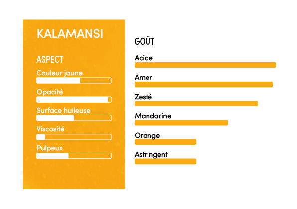 D’une riche intensité aromatique, la purée de Kalamansi révèle des notes zestées, grâce aux huiles essentielles naturelles contenues dans l’écorce des fruits. Elle est complétée par des notes plus douces d’autres agrumes (mandarine, orange).
