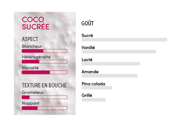 Le produit a une texture onctueuse grâce à un taux de matières grasses élevé. Ces lipides sont aussi à l’origine des notes aromatiques de lait de coco retrouvées dans cette purée.